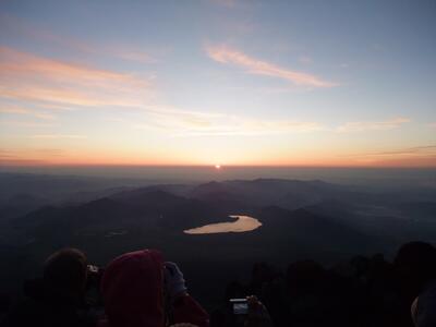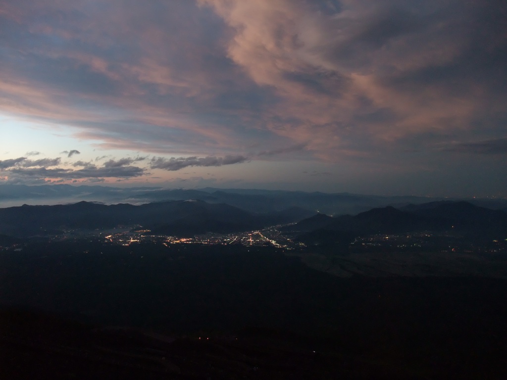 それから 2 時間ほど仮眠して、7 時半頃にはだんだん薄暗くなってきて、 下界にも 明かりが灯り始めた。 問題は、いつ出発するかなんだけど、その日の日の出が 4 時半頃だったので、余裕を見て 5-6 時間あれば登れるとして、 11 時に出れば良いだろうと考えていた。しかし、山小屋のおじさん曰く、3 連休で登山客が多いから、 渋滞してしまって時間がかかるだろうとのこと。9 時ぐらいに出ないと間に合わないと言うので、 それに従って 9 時頃に出発することにした。このおかげで、後でひどい目に遭うことになるのだが…。