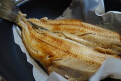 そういえば、全然関係ないけど真ん中のフライパンに収まりきれないくらいの縞ほっけは、